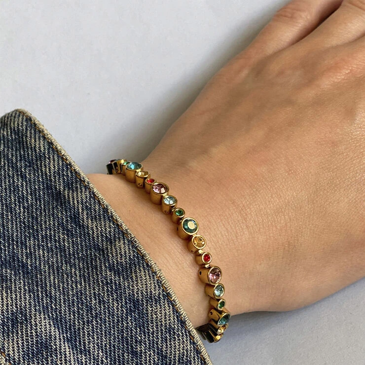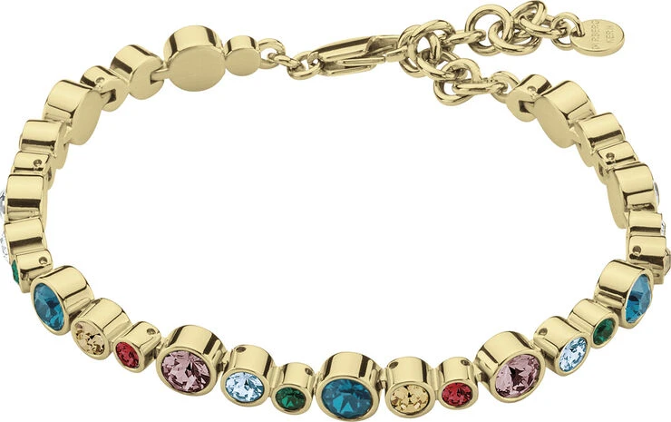 Linked tennis armbånd i guldtonet stål dekoreret med multifarvede krystaller. Nikkelfri.