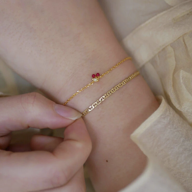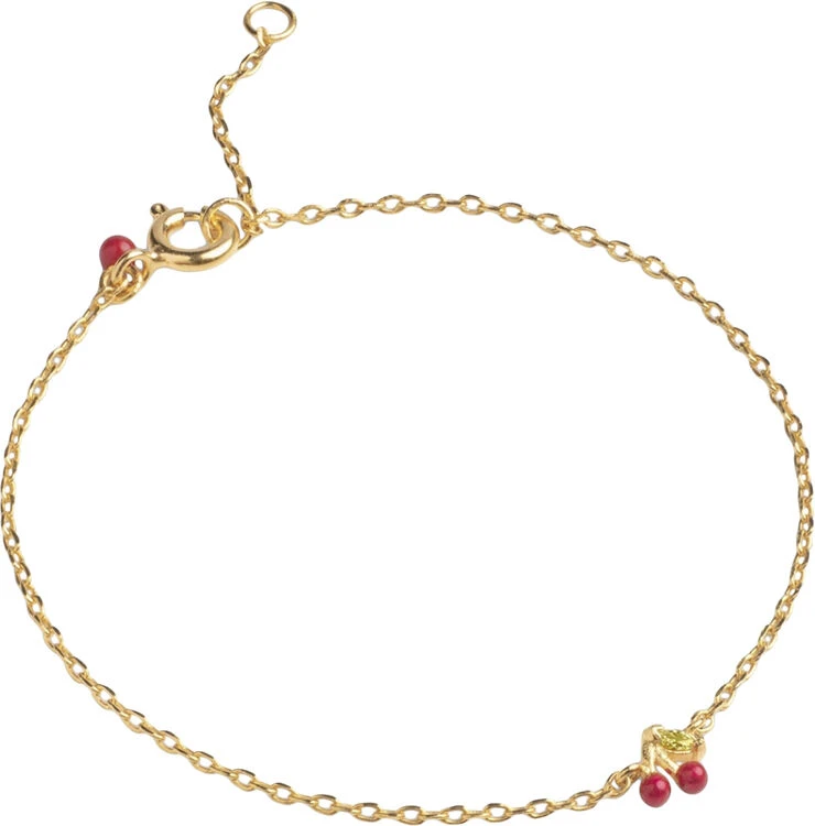 Om smykket- Vores Cherry bracelet giver finurlighed til dit outfit, og tilføjer en legende detalje til dit sommerbrune håndled. ENAMELs kirsebær findes ikke finere, med små emaljekugler og en fin lysegrøn zirkon. Oh so cute!