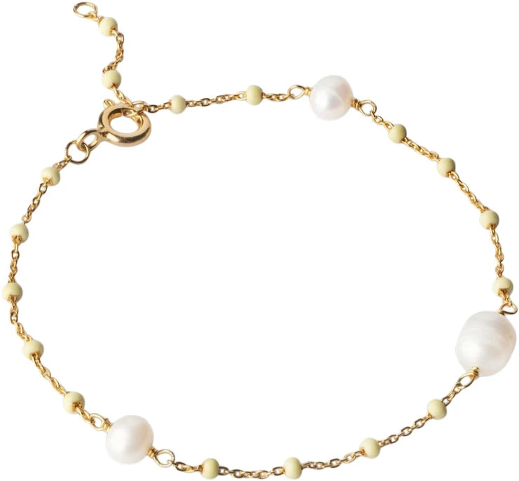 Om smykket- Lola Perlita er en unik og smuk style der med sine tre fine ferskvandsperler og gule små emaljekugler giver en skøn og sommerlig detalje. Lola Perlita står både smukt alene, men er også fin i kombination med andre armbånd. De smukke ferskvandsperler er helt unikke og kan derfor variere i form og størrelse. __________