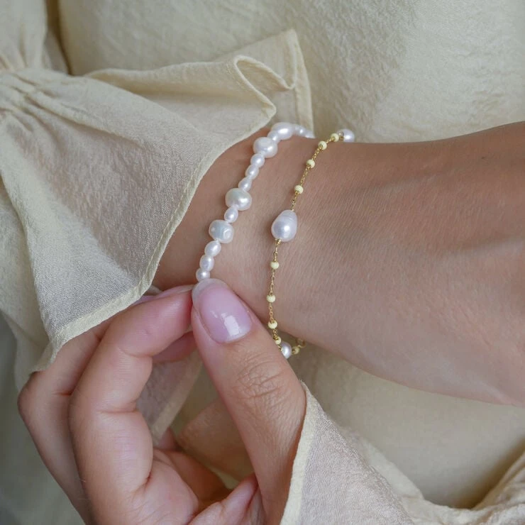 Om smykket- Pearlie bracelet er en smuk og sommerlig style der med sine mange fine ferskvandsperler giver en smuk og feminin detalje, både alene og i kombination med andre armbånd. De smukke ferskvandsperler er helt unikke og kan derfor variere i form og størrelse. __________
