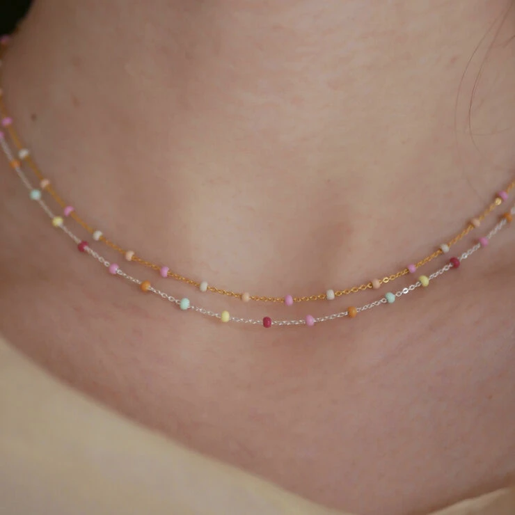 Om smykket- Vores Lola halskæde er en skøn og farverig kæde med små emaljerkugler. Halskæden giver en skøn detalje og kan perfekt kombineres med andre fine halskæder. Obs- Vær opmærksom på IKKE at bære vores Lola styles i bad, når du sover og for tæt på parfumer og cremer, da emaljen kan ændre farve og struktur. __________