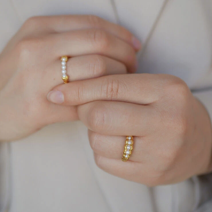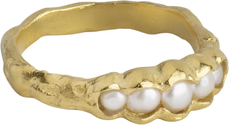Om smykket- Ligesom rå muslinger der gemmer på de skønneste perler, ligger der en fin række perler og titter frem fra en rå ringskinne på vores exceptionelt skønne Idora ring. Idoras neutrale farver gør den nem at sætte sammen med dine andre ringe, samtidig er den helt unik, og vil uden tvivl vække opsigt og beundring.