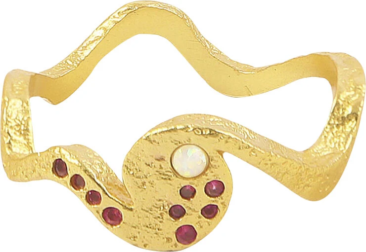 The Opalus ring has 8 ruby colured cubic zirconia and 1 white opal. The texture is hammerhit. Quality: 18K gold plated sterling silver. We have applied 3 micron and e-coating to make the gold plating last. Dimensions: Size 50, 52, 55.