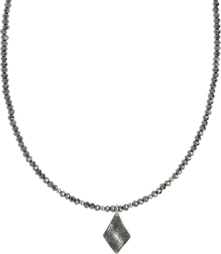 Denne halskæde er med sølvfarvet glasperler og en forølvet rhombus. Vores rhombus kollektion er inspireret af de arkitektoniske linjer i det københavnske bybillede.