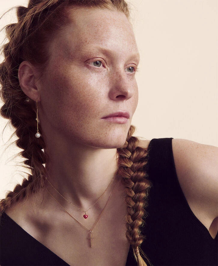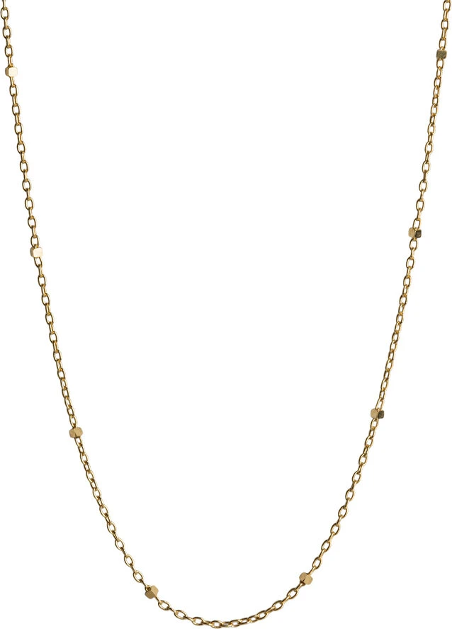 Saturnkæde med karabinlås i 18 karat guld. Halskæden fås i længderne 40 cm og 50 cm. Kæden er en klassisk ankerkæde, og de små firkanter er en ekstra fin detalje, som får kæden til at skille sig ud fra en almindelig ankerkæde.
