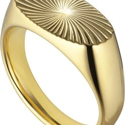 Reflection Signet ring i18 karatforgyldt sterlingsølv med en smuk centreret gravering på toppen af ringen. Ringen måler 9,5 mm. i overfladen. 2 micron guldbelægning. Jane Kønig har med denne ring re-fortolket den klassiske signet ring. Dette er hendes bud på hvordan nutidens signet ring bør se ud. Den store overflade fylder godt på fingeren, og den smukker lysspil som mønsteret kaster fra sig, tillader ingen at ignorere denne smukke ring.