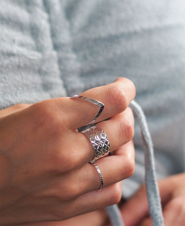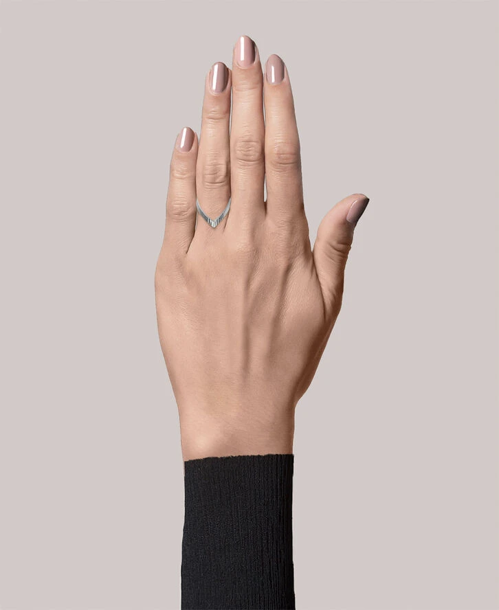 Reflection V-ring isterlingsølv med graveringer, der reflekterer lyset på smukkeste vis. Ringen måler 2,2 mm. i bredden. Vores all time mest populære ring har fået en cool og meget smuk lillesøster. Med dens klassiske form og smukke graveringer forudser vi at denne V-ring kommer til at stå på alle piger og kvinders ønskelister de næste mange år. Ringen passer perfekt sammen med din klassiske V-ring, hvis du er vild med stacking, men den er også absolut smuk og indbydende alene. En ny klassiker er født.