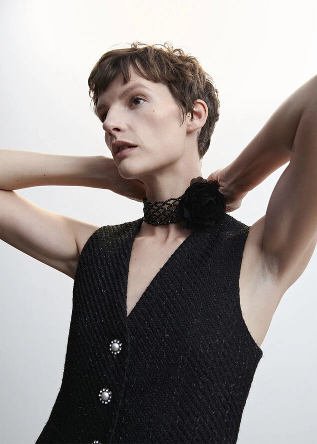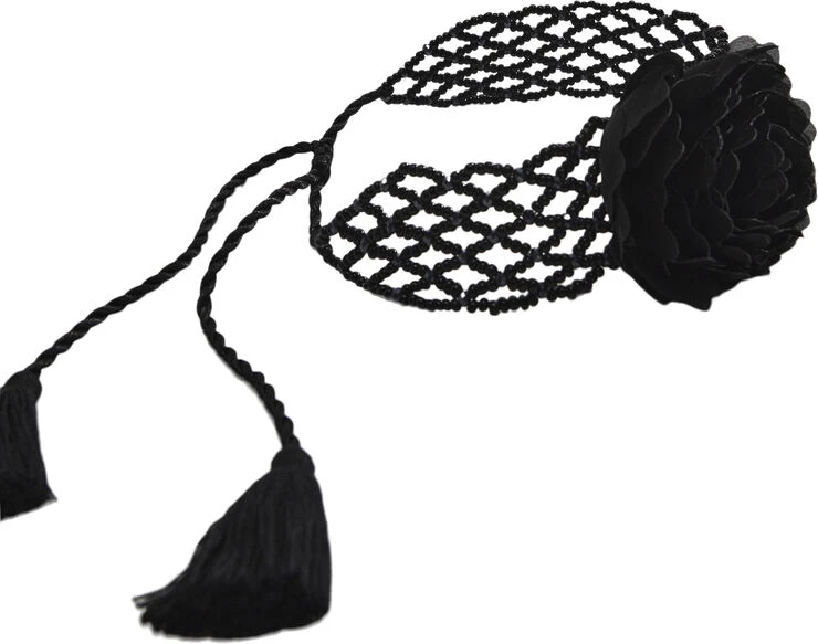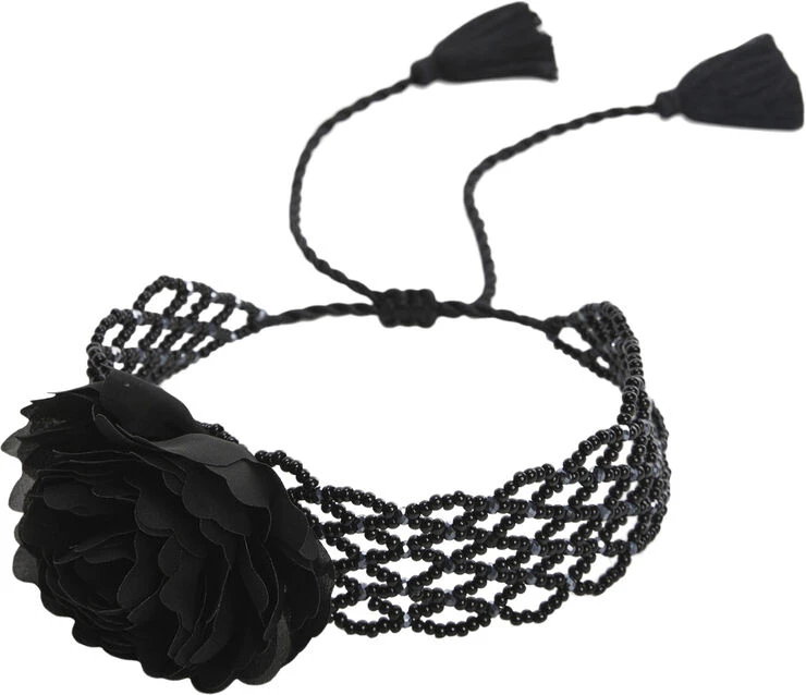 Choker style, beaded panel, flower detail, completed with tassels, knot closure, party and events collection.