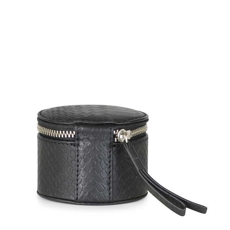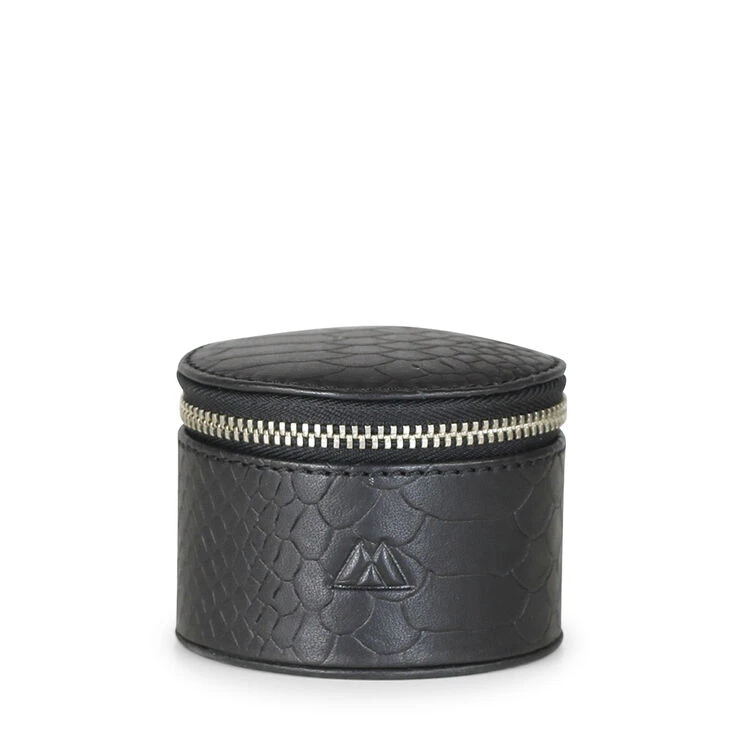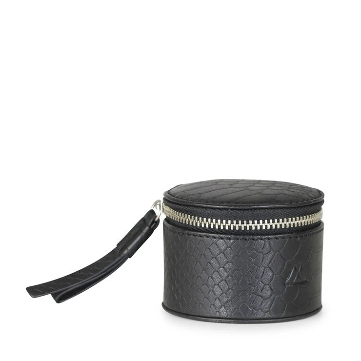 Lova Jewelry Box fra Markberg er en smart smykkebox i skind. Lukkes med lynlås. Indeholder en tyk pude med plads til ringe og øreringe. 3 udtagelige flade lommer med plads til kæder mm. Fast rund form. 100% bomuldsfor. Diameter: 7,5 cm, højde: 6 cm
