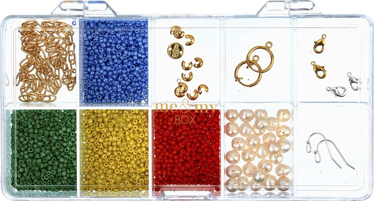 Opbevaringsæske med 10rum til for eksempel smykker eller smykkedele. Æskens låg er forsynet med me&my BOX logo i guldfarvet tryk. Obs: Sæ
