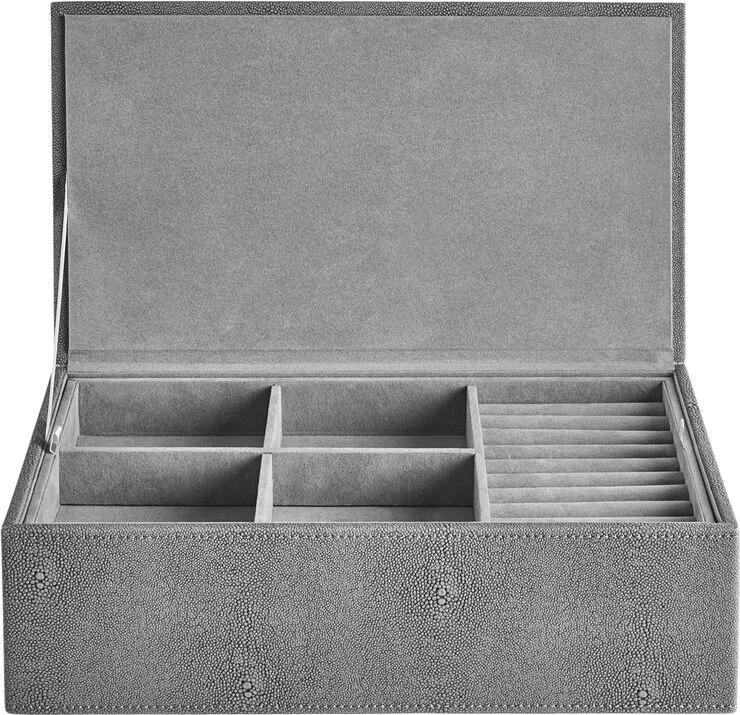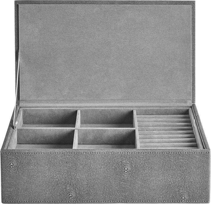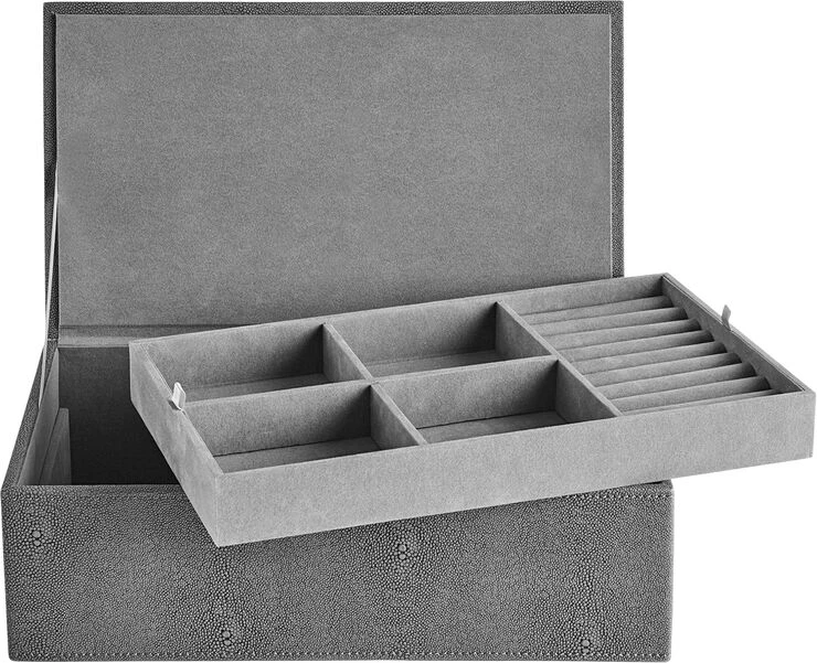 Eksklusiv jewellery box fra vores STING kollektion. Boxen er beklædt med faux stingray og har en mat og blød overflade. Stingray udtrykket kan tilføre både en anderledes og en smuk detalje til din indretning. Opbevar dine smykker med stil og hold orden på dine små skatte.
