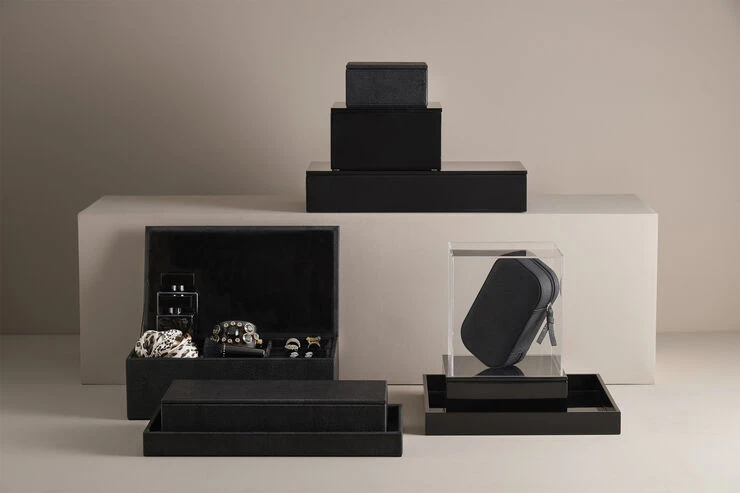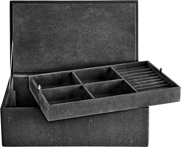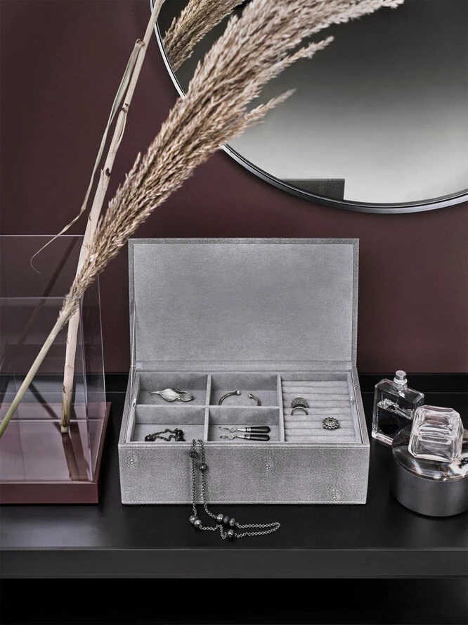 Eksklusiv jewellery box fra vores STING kollektion. Boxen er beklædt med faux stingray og har en mat og blød overflade. Stingray udtrykket kan tilføre både en anderledes og en smuk detalje til din indretning. Opbevar dine smykker med stil og hold orden på dine små skatte.