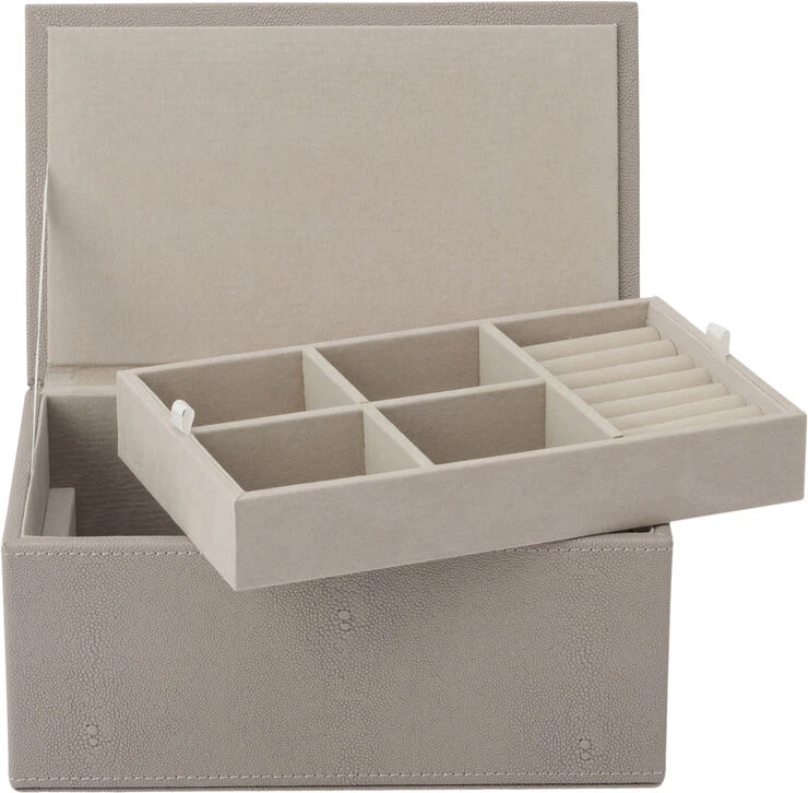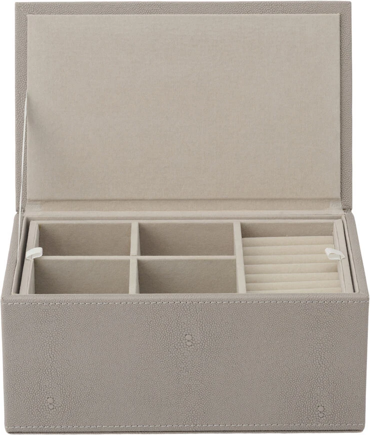 Smuk smykke box fra vores STING kollektion. Æsken er beklædt med faux stingray og har en mat og blød overflade. Design by Mojoo. Brug den til praktiske formål eller kombiner med vores LUX bakker for at skabe en sleek og stylish måde at udstille dine smykker på. Den øverste indsats kan tages ud, hvilket sikrer mere rum til dine ure, ekstra smykker osv.
