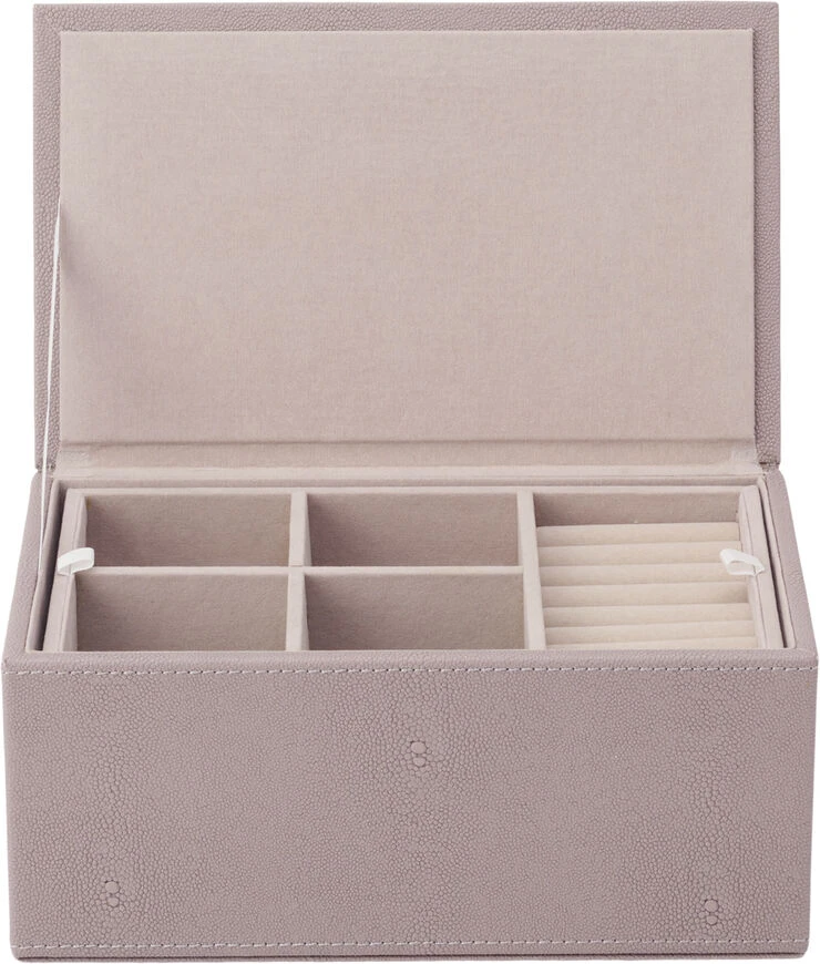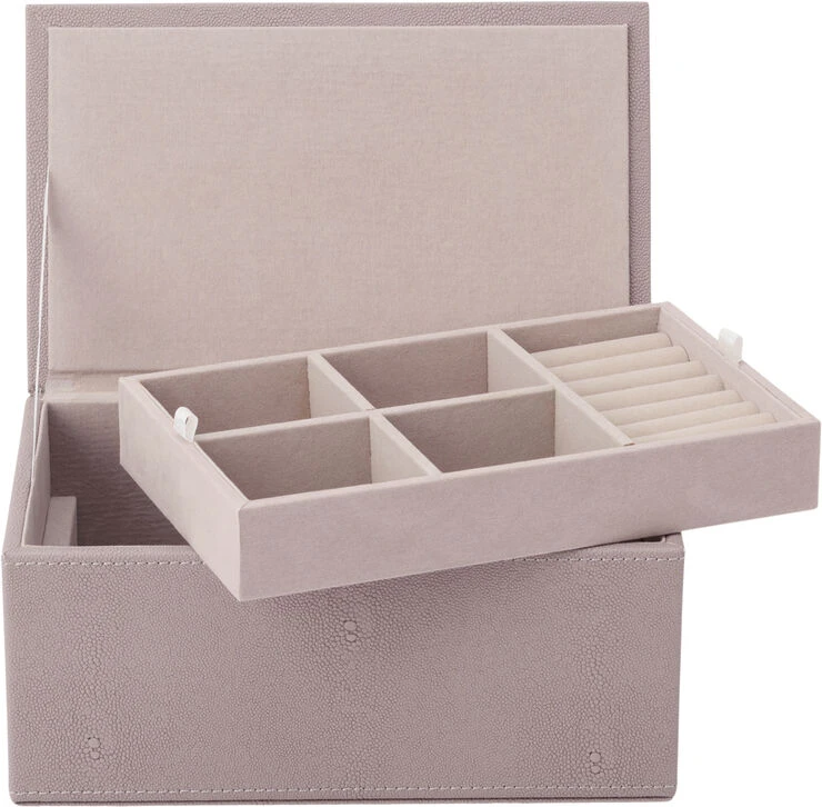 Smuk smykke box fra vores STING kollektion. Æsken er beklædt med faux stingray og har en mat og blød overflade. Design by Mojoo. Brug den til praktiske formål eller kombiner med vores LUX bakker for at skabe en sleek og stylish måde at udstille dine smykker på. Den øverste indsats kan tages ud, hvilket sikrer mere rum til dine ure, ekstra smykker osv.