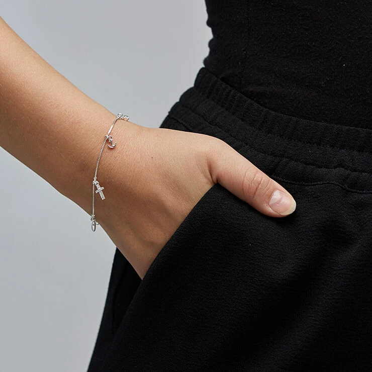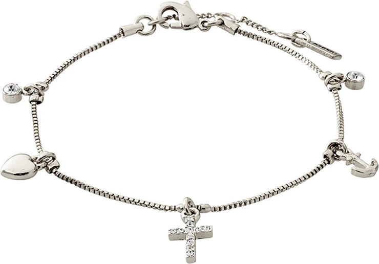 Sølvbelagt armlænke med tre smukke vedhæng, der symboliserer tro, håb og kærlighed. Armlænken har desuden to vedhæng af indfattede Preciosa-krystaller. Hjertet og ankeret har en fin buttet form, og korset er prydet med funklende krystaller. Et armbånd med klassiske symbolske motiver i et funklende design med et smukt og let udtryk.
