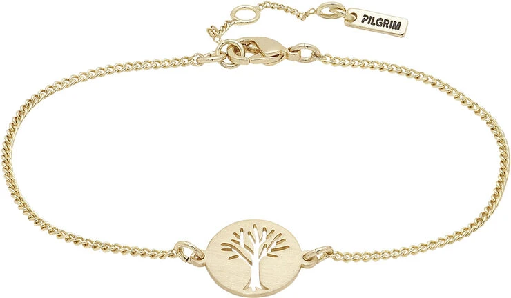 Send en kærlig hilsen til naturen med dette yndige, guldbelagte armbånd. Smykket har et rent og fint udtryk med en spinkel kæde kombineret med en cirkel med mat overflade og en smuk udskæring af et træmotiv. Armbåndets enkle og moderne look bliver i kraft af træmotivet også meget romantisk og feminint, hvilket gør det perfekt til den tjekkede skandinaviske stil.