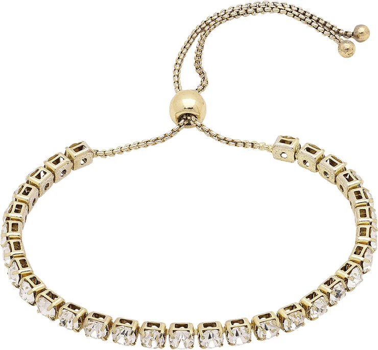 Find din indre diva frem med dette guldbelagte armbånd med den endeløse række af funklende krystaller. Krystal-armbåndet emmer af elegance og eksklusivitet med sit smukke og klassiske design, der samtidig har fået et moderne og forfriskende tvist med den anderledes og moderne lukning, der kan tilpasses i størrelsen og understreger dit divalook.