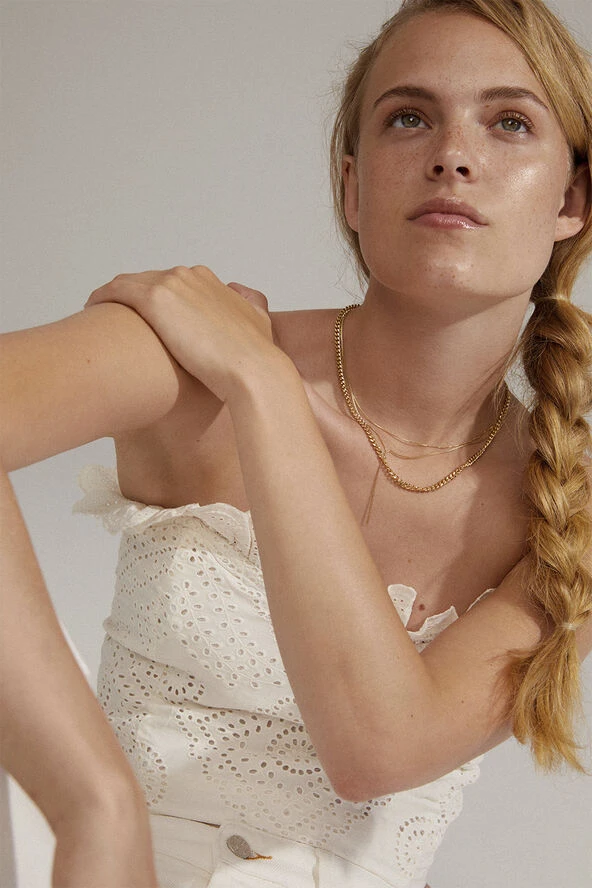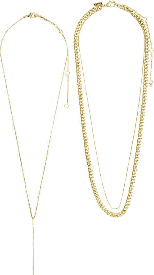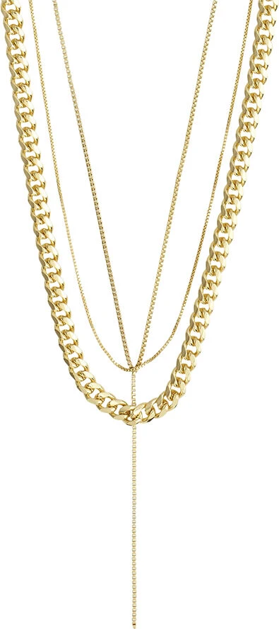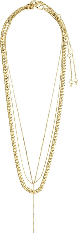 Create your own look and future! Få et unique layered look med den guldbelagte combi-halskæde fra Pilgrims CREATE-kollektion. Kædens forskellige længder og chains giver en cool struktur til dit outfit, mens små Preciosa-krystaller tilfører en classy vibe. Y-kæden kommer for sig, mens den chunky curb chain og tynde box chain er samlet. Style sammen eller hver for sig alt efter occasion. Halskæden måler 40/42 cm + 9 cm forlængerkæde. Recycled item, der er lavet af min. 75 % genanvendt materiale