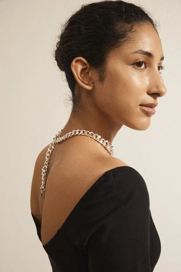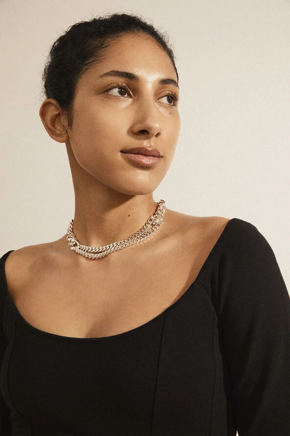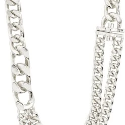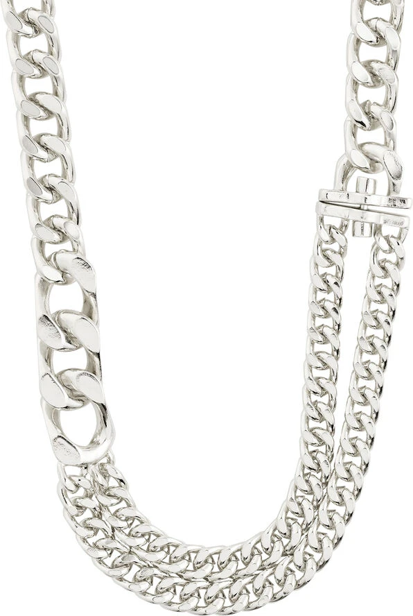 Make every day an adventure. Forfølg nye eventyr med Pilgrims sølvbelagte panzerkæde fra Friends-kollektionen. Kædens asymmetriske curb chain-design har et ultra cool industrial look, der understreges af designets monokrome udtryk og chunky feel. Gå vinterens power looks i møde, og bær kæden helt kort tæt på halsen som en længere kæde eller som en trendy Y-chain. Its your choice! Halskæden måler 40 cm + 9 cm forlængerkæde.