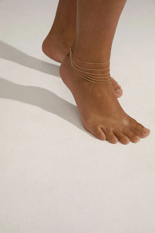 Press pause and enjoy the moment. Den guldbelagte ankelkæde fra Pilgrims PAUSE-kollektion består af seks kæder i forskellige længder, der skaber en smuk og eye catching waterfall-effekt om din ankel. Et must-have piece, som er oplagt at style med chunky sandaler og en cool tåring til sommerens mange fester. Et recycled item, der er lavet af min. 75 % genanvendt materiale.
