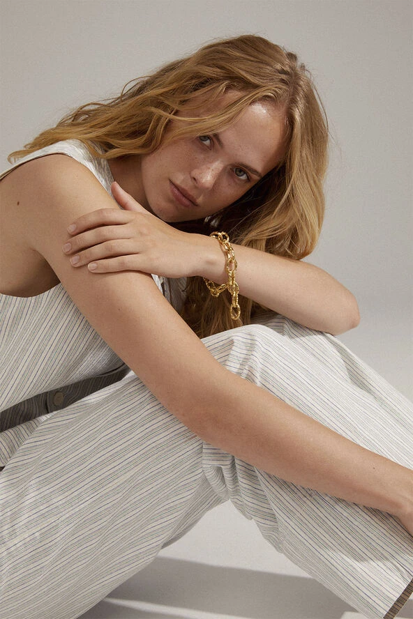 Set yourself free med det chunky og rå armbånd fra Pilgrims REFLECT-kollektion, der er lavet af min. 75 % genanvendt materiale. Den guldbelagte cable chain har et rustikt handcrafted look, der forener urban vibes med high-class style. Tilføj edge til dit outfit, og leg med at sammenstille den rå energi med en enkel kjole eller en silky shirt.