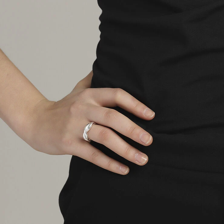 En smuk og stilren sølvbelagt ring med en rustik snoning, der ligger oven på fingeren. Lys og skygge forenes i den blanke snonings bløde former. Dette meget klassiske skandinaviske design har rødder i myten om gudinden Skuld, der snor sine fine tråde for fremtiden. En ring, der udstråler en feminin karakterfuldhed og en betagende tidløs skønhed.