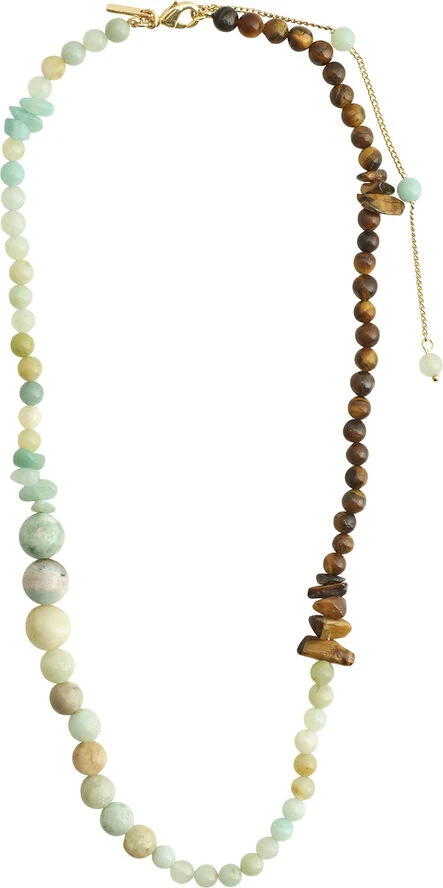 Be brave, be bold, be you! Halskæden fra Pilgrims Soulmates-serie er sammensat af halvædelstenene amazonit og tigerøje, en kombi, der repræsenterer selvværd og mod. Kæden måler 38 cm + 12 cm forlængerkæde og er i asymmetrisk kombination med nuancer af lyseblå, sand og mørkebrune perler, som hver og én er unikke i deres farve og form. Brug halskæden, når du trænger til et boost, og sæt samtidig et fint boho-touch på dit look.