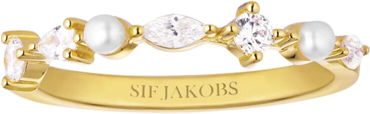 Ring i 925 sterling sølv, forgyldt med 18 karat guld, blankpoleret overflade, med håndsatte facetslebne hvide zirkoner og ferskvandsperler.