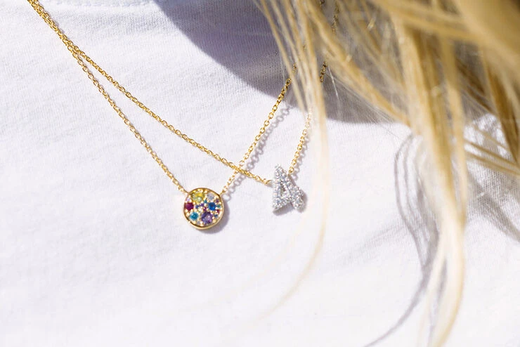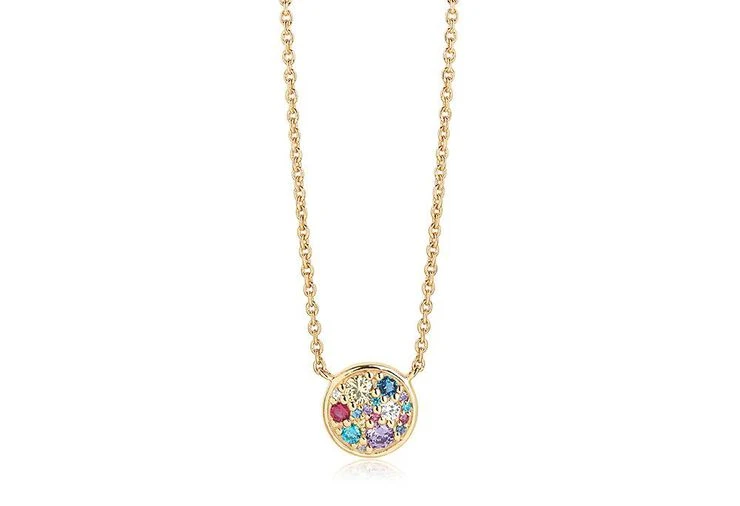 Halskæde i sterlingsølv 925 forgyldt med 18 karat guld med blankpoleret overflade og facetslebne multifarvede zirkoner.